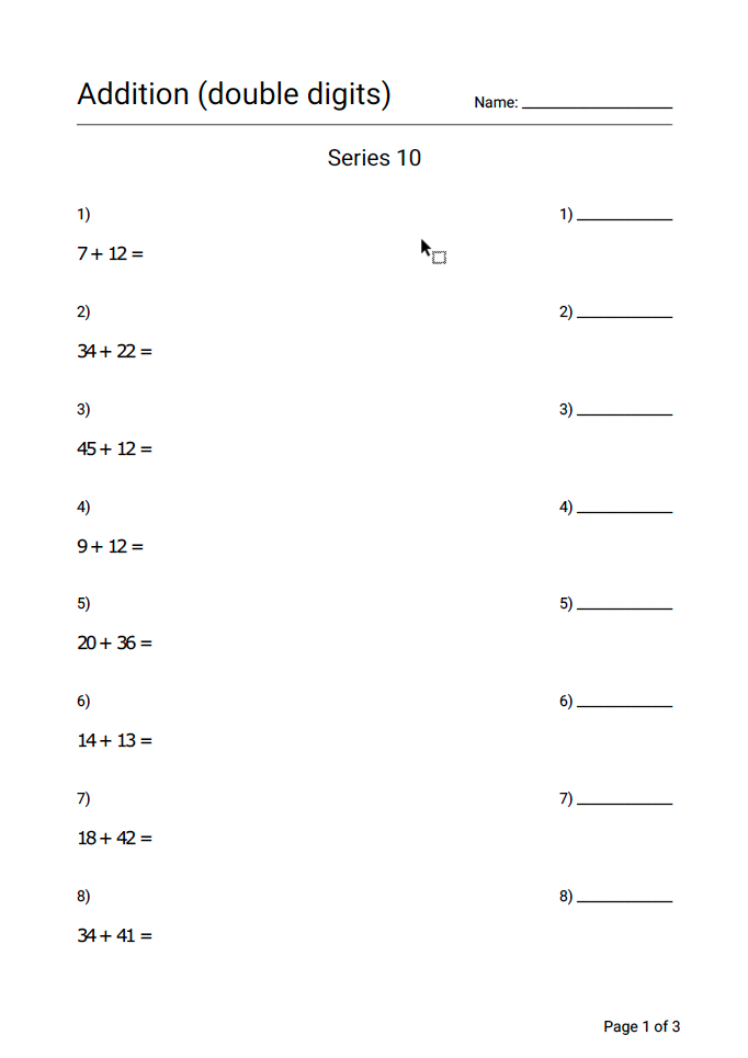 Math addition worksheet and solution sheet. Contains 25 double-digit addition problems formatted for easy printing.