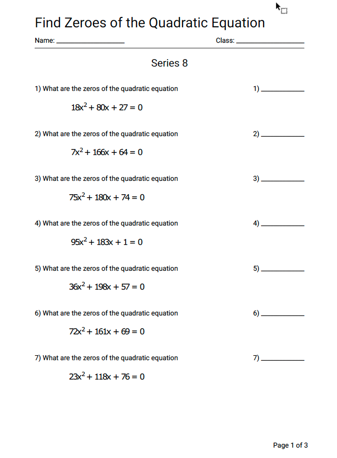 Math Quadratic Equation Zeroes Worksheet Series 8